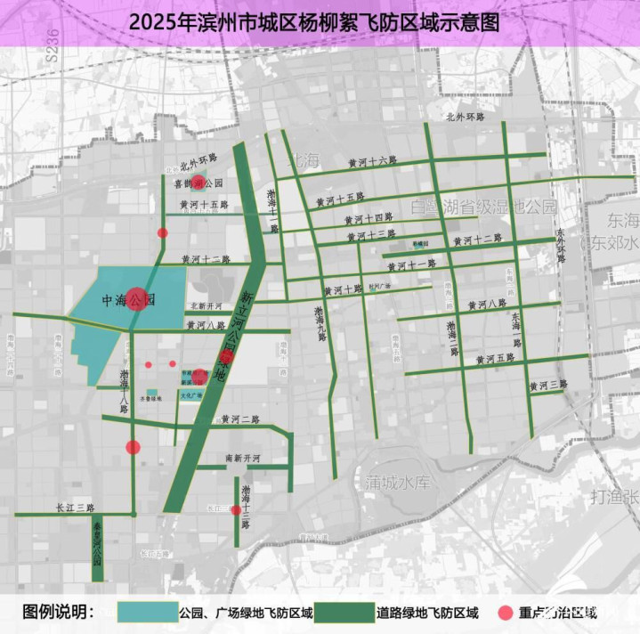 喷洒区域:滨州市城区范围内杨柳树集中种植区域,详见《2025年滨州市城区杨柳絮飞防区域示意图》。其中红色标记为第二期重点防治区域。